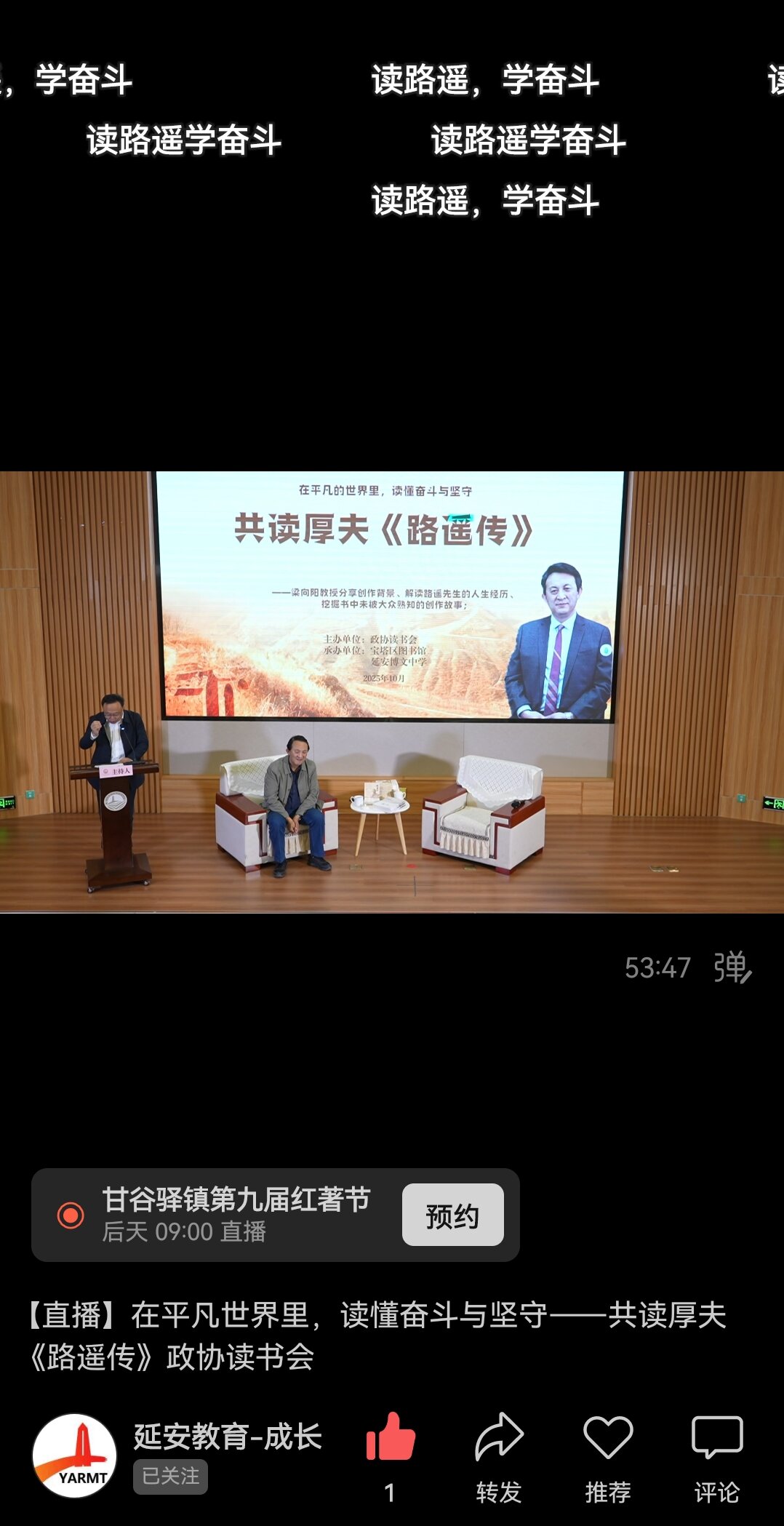 为激发更多人参与阅读的热情,活动设置“直播互动抽奖”环节。现场及线上书友在评论区留言“读路遥,学奋斗”或分享对“奋斗与坚守”的感悟,即可参与抽取梁向阳教授亲笔签名的《路遥传》。