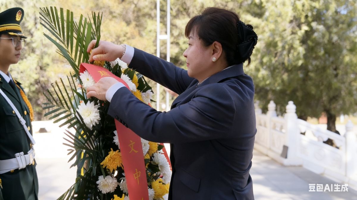 伴随着现场低沉肃穆的旋律,教师代表缓步走到烈士纪念碑前,俯身细心整理花篮挽联。他们轻轻抚平缎带的褶皱,让寄托着全校师生敬意的挽联,以最郑重的姿态朝向纪念碑,将教育工作者对革命先辈的追思与传承使命,融入这静默而庄重的一瞬。