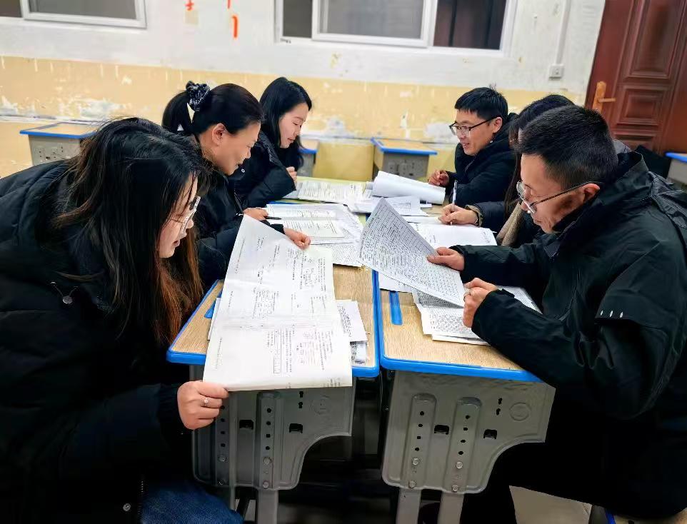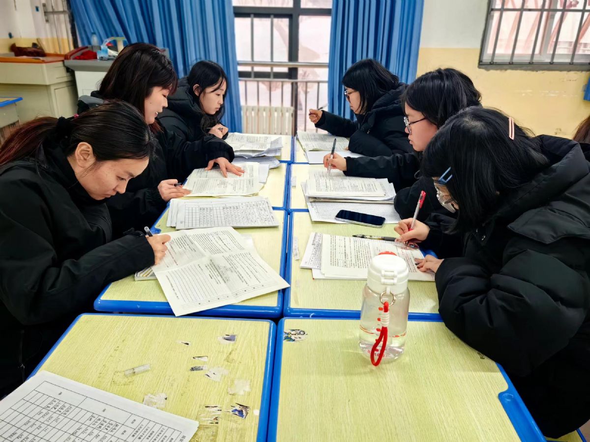 下午,各备课组接续在二楼教室召开专题研讨会议。老师们以期末学业成绩为精准切入点,深入剖析试卷中的典型错题、高频失分点,对照既定教学目标逐项拆解各知识点的课堂落实成效,深挖教与学双向问题根源,让备课组的教学反思真正扎根课堂细节、落到实处。
